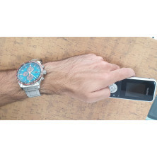 Este relógio automático têm a traseira da caixa transparente, que permite ver todo o seu mecanismo. Têm um mostrador branco com ponteiros azuis.